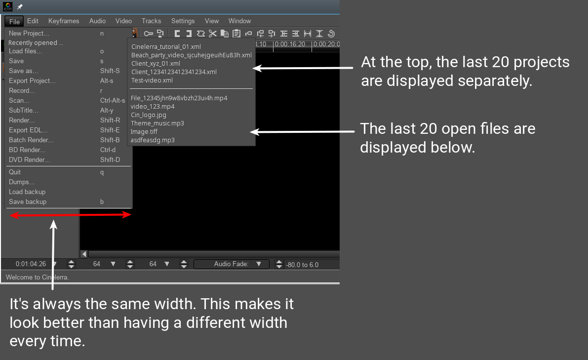 | Description | It's only a small improvement, but for me as a designer and aesthetician it's an important change. From the very first hour, I've been annoyed that the File drop-down menu always has a different width. It looks unprofessional and ugly. With the following changes it improves: 1. the file-menu always has the same width. 2. it looks more aesthetic. 3. by lifting the submenu up, I have more space down to show more recently opened projects. 4. the space gained also allows me to display the most recently opened files, if desired. 5. the different width of this sub-menu is not considered annoying because it is not part of the main menu. This small change ensures that Cinelerra is not only improved from a feature point of view, but also aesthetically. | ||||