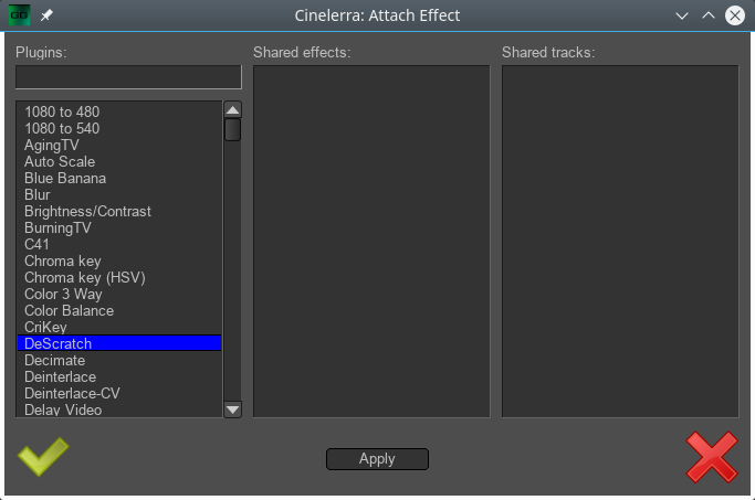 | Description | I was about to add several effects via the "Attach effect" window when I noticed that there was no Apply button at all. I have to open this window again every time. It would be better if I could stay in this window and insert several effects. It was similar with the load window until a apply button was added. | ||||