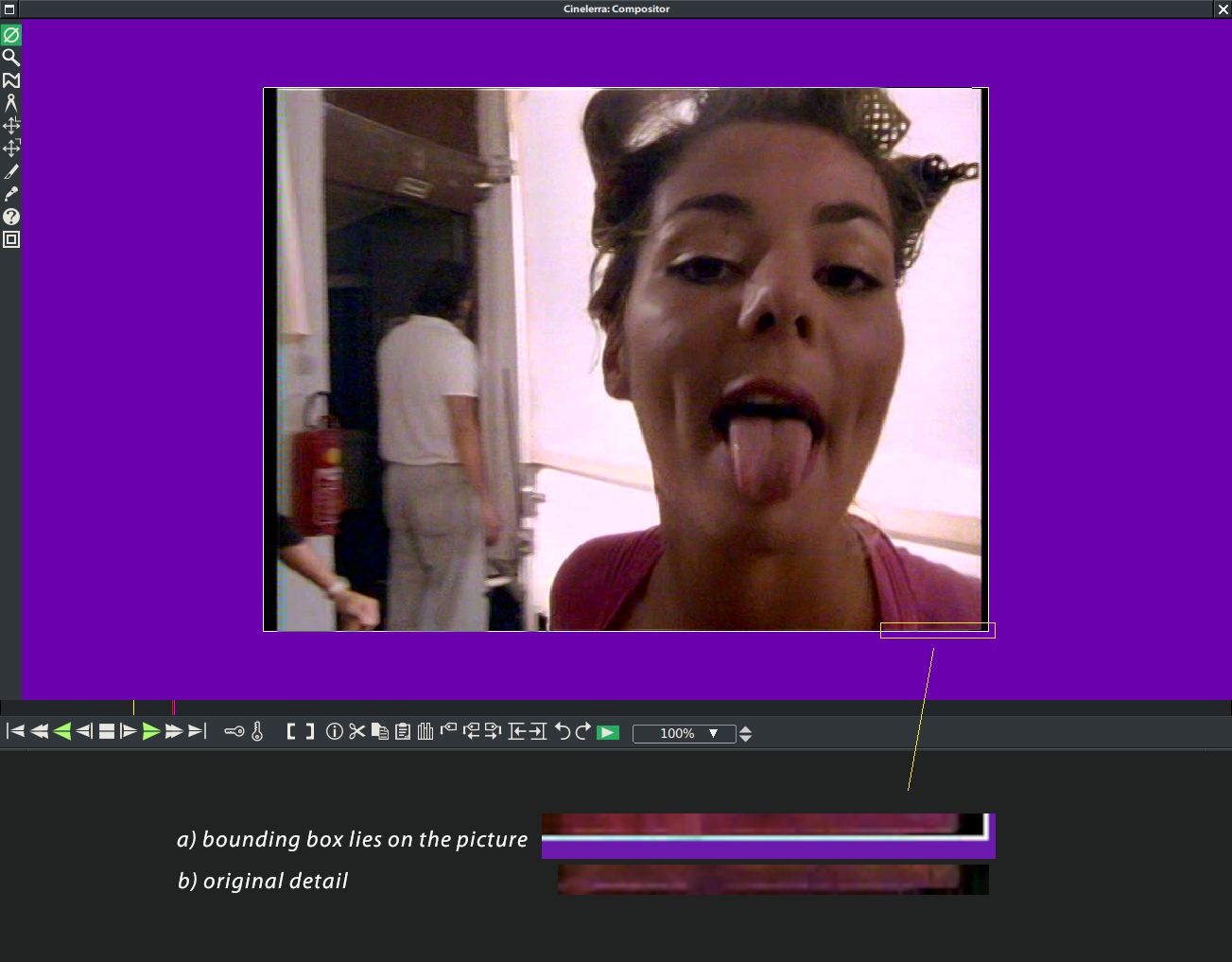 Okay Olaf, I saw your photomontage, and I understood. In your image seems that you loose (you can not see) a lot of pixels. I confirm that bounding box is on the video and by my test that boundary line is 1 pixel width, I think. Of Course, 1 pixel width is a “big” value if the size of the Compositor window is very little (with Zoom= Auto) because it hides more video information; usually, in my old Notebook the Compositor size is about 530x400 pixels. I can not tell you that it is important for me like for you, but I can agree with you that the boundary line should not cover the video information. In the Compositor I can see the differences on the video if I toggle between play and stop. In the output render I don’t see lack of information. |
