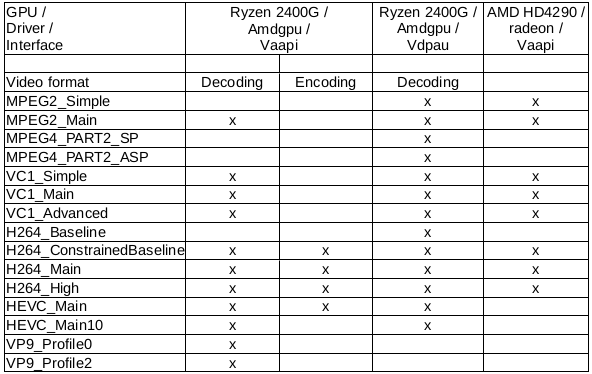 Phyllis: Just a note: In the ¨speedup¨ pdf the output of vdpauinfo shows it to be a layer on top of vaapi. This of course limits the vdpau capabilities to that of the underlying vaapi. On my amdgpu driver, the two are separate; hence vdpau supports some formats that vaapi does not, and vice-versa/ |