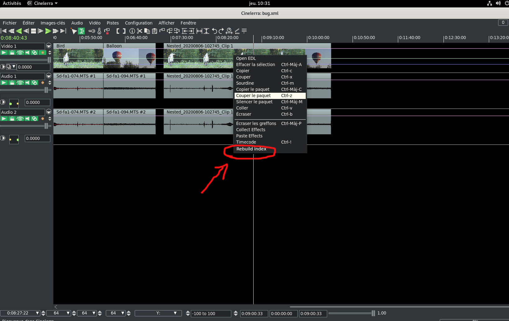 OK, I did not run my test correctly and now I have correctly tested on the Debian 10 tar file that you used and it works when I did it right. You can see how I followed your steps 1-3, 5-7 in your bug.webm. https://streamable.com/o1fm4s So it really should work for you also. The important thing that GG mentioned is that clips are always just copies so you have to be sure to drag the actual nested clip to the timeline and use OpenEDL on that. This is what I finally got right and then after OpenEDL, I did a cut of a large section, and popped back up from level 1 to level 0 and the dragged nested clip on the timeline was shortened also. However, what I got wrong was that I expected the original clip that I had also dragged to the timeline to be cut also, and that is not true because it is only a copy. I tried 3 different times with each time working correctly. However, I did find another problem which is that when you pop back up, the thumbnails on the timeline were in cache so looked wrong even though it shows the correct video in the compositor. GG will try to get this fixed today. P.S. I played the big red ball scene twice because I just think it is so funny. |