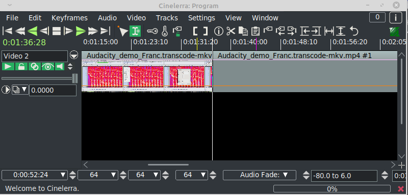Steps To ReproduceEDL file loaded in Cin, delete the empty first video and two audio tracks. 1 video and 2 audio tracks left. Cut and paste mode, time format with frames.