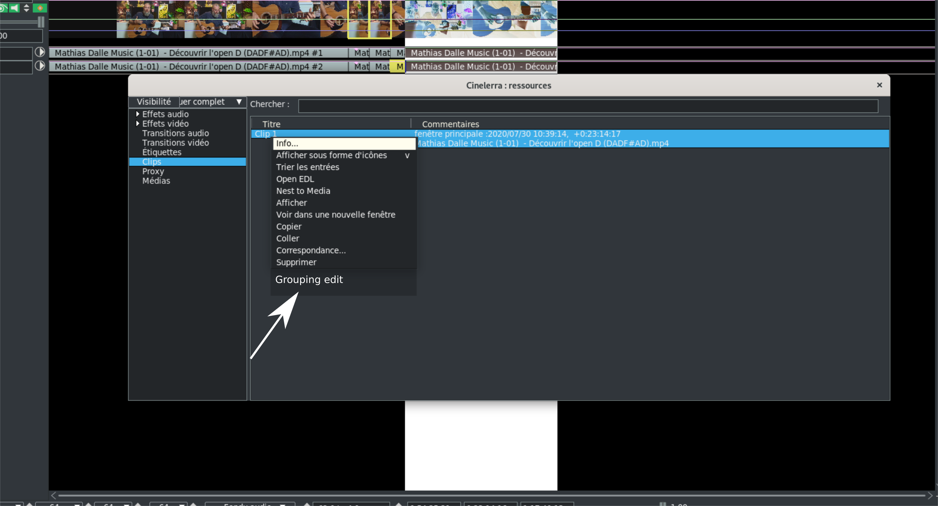 @PhyllisSmith I am very happy that you take charge of this file. I also think it's important to be able to group multiple clips into one command. To make your life easier, here is a copy and paste of my proposal from 0000466. Of course, I remain at your entire disposal for any further information. --- I allow myself to bounce back on the subject raised to offer you some improvements on the management of grouping edits (chapter 5.5.2 in the manual), namely: Currently, we must select the edit one by one to make a group and it's perfect to create a small group. What about a big group of several edits ?. In that case, - It would be interesting to be able to create a group including all edits of a clip. e.g: To create an editing group easily and quickly, all you need to do is create a clip. Use the menu of this clip then choose "Grouping edits" then move this clip on timeline > picture 1 - It would be interesting to be able to create a group easily and quickly to select the first edit of a track and the last edit of another track via a key combination (e.g:Hold down shift+alt and left mouse click) > picture 2 --- What do you think ? |