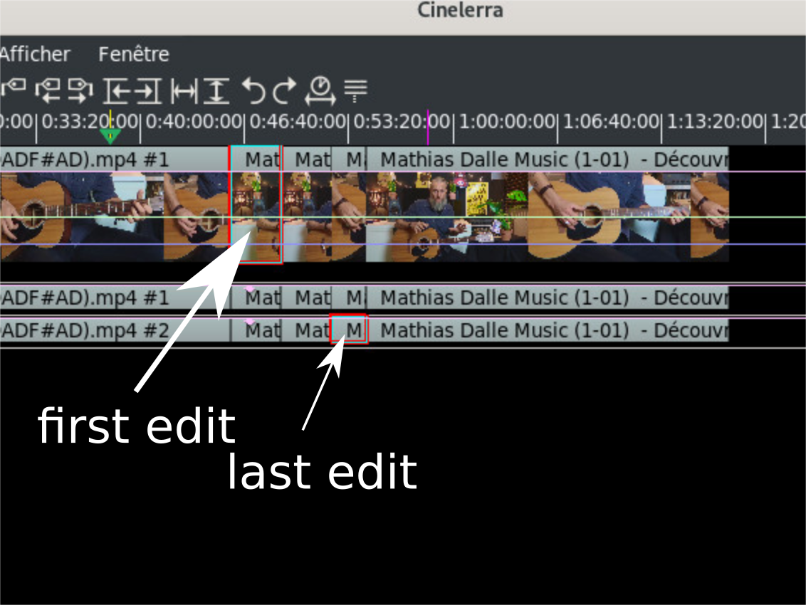 @PhyllisSmith Quote: "- Second way" is implemented but with a shortcut of Ctrl-Alt-a because GG wanted to include an "a" like when you make a selection uses the "a". I think it is really good as it works. Thank you so much GG/Phyllis! For me it is good the "Ctrl+Alt+A" shortcut, but sometime I would reserve shortcut for something else. If my First way suggestion ( https://www.cinelerra-gg.org/bugtracker/view.php?id=494#c3929 ) were implemented then you could select the edits inside the area using only DragAndDrop and deselect, the edits inside the area, using Shift+DragAndDrop. (Only when you are in "Drag and Drop Mode") About "is it possible to know the procedure for deselecting a large number of clips... ?" The new "Select edits (Ctrl+Alt+A)" could be toggled. So, if you have previously selected some edits and with I-Beam highlight an area where there are edit selected, those edit will be deselected when you use "Select edits (Ctrl+Alt+A)" on it. Or adding another option, "Deselect edits", on MMB (Middle Mouse Button). I don't like this option. |