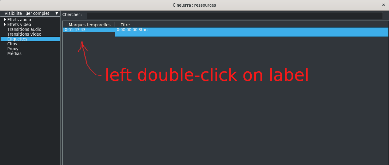| Description | In my case, I make video montages lasting more than an hour. So I put a lot of labels on the timeline to find a specific place or time in my film. Currently, you have to use the labels menu to go to a specific location on the timeline (resource window). At this level, the risk of accidentally deleting a label is very real. Would it be possible to improve it so that a simple double left click on a label would have the same effect. (see picture) I'm not a programmer, but I think it's a small modification that won't take you much time. However, it would greatly improve the speed and efficiency of movement. | ||||