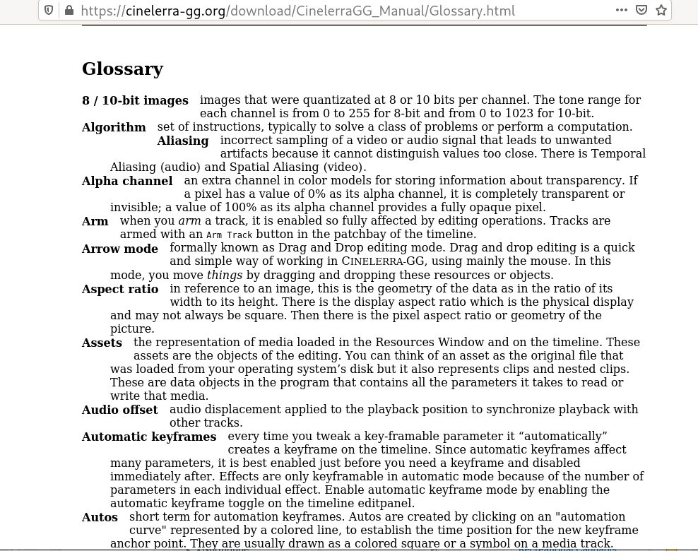 @PhyllisSmith I understand now the reason for strange indentations in Glossary. It is due to strange parameters of the bold font. You can see that each second line of a multiline Glossary description is indented exactly as the first line. It is controlled not by latex2html, but by the browser. Perhaps the depth of glyphs in this font is slightly bigger, and it leads to such indentation. You can notice that the description preceding to 'Aliasing' is exactly one line long. The word 'Aliasing' occupies the second line, therefore is indented equally. The second line under 'Aliasing' is indented yet more, but the third line has a normal indentation again. Browser is responsible for such a formatting. Perhaps with other browser, or with other fontset it will look differently. In principle, it is possible to modify Glossary processing in latex2html to yield pages formatted in a way similar to the description list in https://cinelerra-gg.org/download/CinelerraGG_Manual/Track_Popup_Menu.html. Do you mean that such Glossary, with new line after each item, will look better? I don't want BT540 being closed yet. I am planning to experiment with keystrokes a bit more, to get some kind of a context help in CinGG. So let's leave it also opened. I suspended my playing with it because it depends on the HTML manual itself, and stabilizing this form of the manual was of a higher priority. |