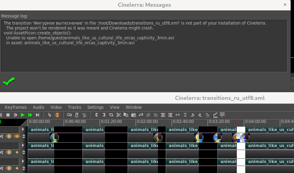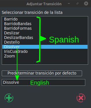 | Description | This dialog works perfectly in English, but only in English, I have tried in Spanish, French, of which I have some notions, then in German, etc, they are languages that I do not know, but I have been guided by the position of the buttons and it does not work , the error that appears is the following: int VModule::render(VFrame*, int64_t, int, double, int, int, int): missing transition plugin: Disolver I also note that the default transition is not translated, and it works until another or even the same is chosen. Let me explain, in the default transition in Spanish it indicates "Dissolve" which is the term in English and this way it works when I use its keyboard shortcut "Shift U" but when I want to change the default it already writes in the language in which we have the application and stops working. | ||||