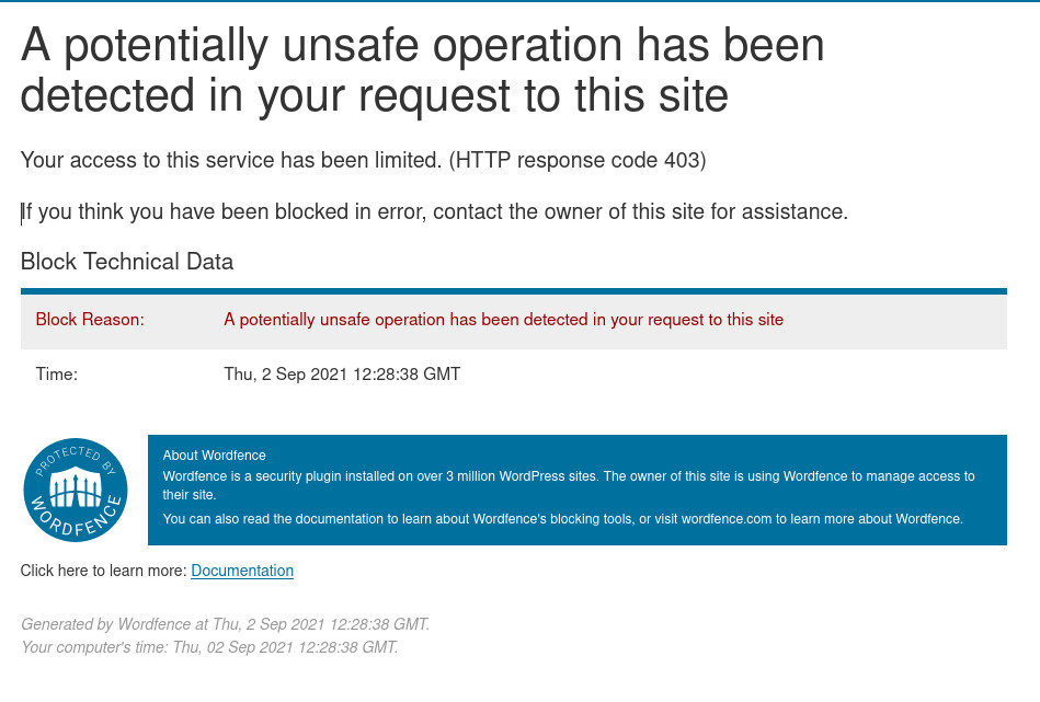 I apologize for only answering you now but I was away from my home for professional reasons. I can confirm that everything is working normally, I can post on the forum again without any problem. @IgorBeg "Does the problem happen when logging in or posting a message ?" I didn't have a problem when logging in but only when posting a message. "Capture d’écran de 2021-09-02 14-30-37.jpg" About the file I posted "Screenshot of 2021-09-02 14-30-37.jpg". I didn't understand your explanation, is my way of doing this incorrect? If so, please tell me how I should post an image without causing you problems. @PhyllisSmith "Another thing to try: uncheck the box Remember Me". I never checked the "Remember Me" box. "Method 4: By Turning Off Enable Rate Limiting and Advanced Blocking Option. Step 1:Go to WordPress Dashboard and Navigate to All Options Tab Under Wordfence. Step 2:Click Rate Limiting Option and Just Turn Off Enable Rate Limiting and Advanced Blocking Option. That’s It! You’re Done Man! " I can't find any of these options in my forum profile. Anyway, I thank you all for helping me and unblocking me. |