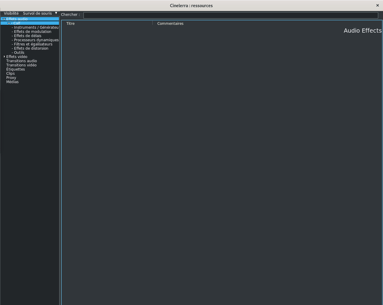 @IgorBeg I have just started your procedure again, taking into account your comments and advice. 1. Create directories and sub-directories in your Home $ mkdir -p ~/plugins_lv2-calf_for_Cin{,/x86_64-linux-gnu,/lv2} 2. Copy the Calf directory from /usr/lib/x86_64-linux-gnu/ to the created directory $ cp -a /usr/lib/x86_64-linux-gnu/calf ~/plugins_lv2-calf_for_Cin/x86_64-linux-gnu/ 4. Copy the calf.lv2 subdirectory from /usr/lib/lv2/ to ~/plugins_lv2-calf_for_Cin/lv2/ $ cp -a /usr/lib/lv2/calf.lv2 ~/plugins_lv2-calf_for_Cin/lv2/ 5. Edit the file ~/.bcast5/cinelerra.rc $ nano ~/.bcast5/Cinelerra_rc and replace the line "LV2_PATH /usr/lib/lv2" with "LV2_PATH $HOME/plugins_lv2-calf_for_Cin/lv2". 6. Restart cinelerraGG $ CinGG-20210831-x86_64.AppImage CinelerraGG restarts, I have the Calf directory and its subdirectories but no filters in these subdirectories. 7. For testing, copy all LV2 plugin that begin with a-* (6 plugins) $ cp -a /usr/lib/lv2/a-*.lv2 ~/plugins_lv2-calf_for_Cin/lv2/ 8. Restart cinelerraGG $ CinGG-20210831-x86_64.AppImage CinelerraGG restarts, but again I have the Calf directory and its subdirectories but no filters in these subdirectories. |