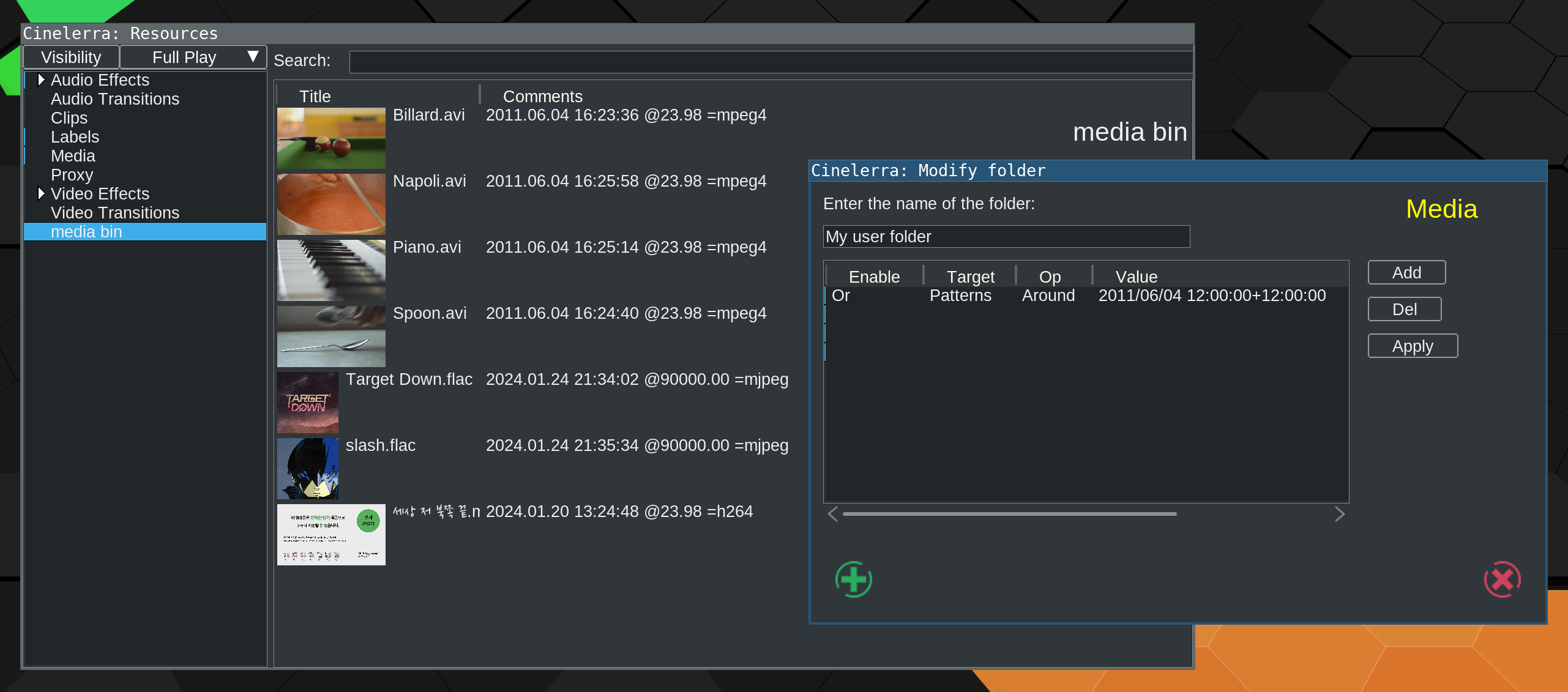 | Steps To Reproduce | 1. Load media files modified on different dates, e.g. 2011/06/04 and 2024/01/24. 2. Create a user folder and bring up the Modify folder window. 3. Add the following filter rule, replacing the "YYYY/MM/DD" part with the date one of the files was modified: Enable | Target | Op | Value Or | Time | Around | YYYY/MM/DD 12:00:00+12:00:00 4. You will notice that all files from the Media master folder are also in the user folder. However, the folder should contain only the files modified on that date. | ||||