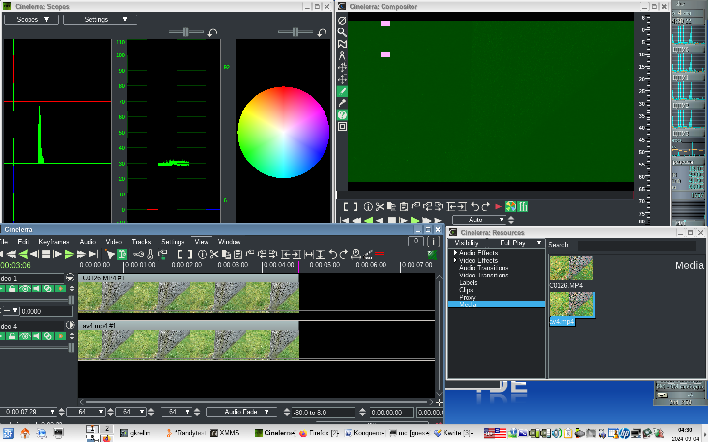 Playing with this command: ffmpeg -f lavfi -i yuvtestsrc -frames 1 -color_range 2 /dev/shm/yuv-test.y4m ffmpeg version 4.4.4 Copyright (c) 2000-2023 the FFmpeg developers built with gcc 11.2.0 (GCC) configuration: --prefix=/usr --libdir=/usr/lib --shlibdir=/usr/lib --docdir=/usr/doc/ffmpeg-4.4.4/html --mandir=/usr/man --disable-debug --enable-shared --disable-static --enable-gpl --enable-version3 --enable-avresample --arch=i586 --enable-libfontconfig --enable-libfreetype --enable-libfribidi --enable-gnutls --enable-libass --enable-libbluray --enable-libcdio --enable-frei0r --enable-libgsm --enable-openal --enable-libopus --enable-librtmp --enable-libsnappy --enable-libspeex --enable-libssh --enable-libtheora --enable-libtwolame --enable-libv4l2 --enable-libvidstab --enable-libvorbis --enable-libvpx --enable-libwebp --enable-libx264 --enable-libx265 --enable-libxvid --enable-libmp3lame --enable-opencl --enable-opengl --enable-libopenjpeg --disable-libpulse --enable-libsmbclient --enable-libsvtav1 --enable-libxml2 --enable-librsvg --enable-libdrm --enable-libaom --enable-libdav1d --enable-libsoxr --enable-libzimg --enable-vapoursynth libavutil 56. 70.100 / 56. 70.100 libavcodec 58.134.100 / 58.134.100 libavformat 58. 76.100 / 58. 76.100 libavdevice 58. 13.100 / 58. 13.100 libavfilter 7.110.100 / 7.110.100 libavresample 4. 0. 0 / 4. 0. 0 libswscale 5. 9.100 / 5. 9.100 libswresample 3. 9.100 / 3. 9.100 libpostproc 55. 9.100 / 55. 9.100 Input #0, lavfi, from 'yuvtestsrc': Duration: N/A, start: 0.000000, bitrate: N/A Stream #0:0: Video: rawvideo (444P / 0x50343434), yuv444p, 320x240 [SAR 1:1 DAR 4:3], 25 tbr, 25 tbn, 25 tbc File '/dev/shm/yuv-test.y4m' already exists. Overwrite? [y/N] y Stream mapping: Stream #0:0 -> #0:0 (rawvideo (native) -> wrapped_avframe (native)) Press [q] to stop, [?] for help Output #0, yuv4mpegpipe, to '/dev/shm/yuv-test.y4m': Metadata: encoder : Lavf58.76.100 Stream #0:0: Video: wrapped_avframe, yuv444p(pc, progressive), 320x240 [SAR 1:1 DAR 4:3], q=2-31, 200 kb/s, 25 fps, 25 tbn Metadata: encoder : Lavc58.134.100 wrapped_avframe frame= 1 fps=0.0 q=-0.0 Lsize= 225kB time=00:00:00.04 bitrate=46094.6kbits/s speed=36.2x video:0kB audio:0kB subtitle:0kB other streams:0kB global headers:0kB muxing overhead: 58100.253906% src for command: https://stackoverflow.com/questions/75260266/why-is-ffmpeg-biased-when-converting-to-16-bit-integer-or-32-bit-float-rgb-outpu references ffmpeg bug https://trac.ffmpeg.org/ticket/7978 "Summary of the bug: inaccurate conversion from YCbCr Narrow range to RGB Full range " But I use cingg for comparing .. bash-5.1$ cin /dev/shm/yuv-test.y4m Cinelerra Infinity - built: Aug 26 2024 06:26:42 git://git.cinelerra-gg.org/goodguy/cinelerra.git (c) 2006-2019 Heroine Virtual Ltd. by Adam Williams 2007-2020 mods for Cinelerra-GG by W.P.Morrow aka goodguy 2003-2017 mods for Cinelerra-CV by CinelerraCV team 2015-2024 mods for Cinelerra-GG by Cinelerra-GG team Libav version: Lavc61.3.100 Cinelerra is free software, covered by the GNU General Public License, and you are welcome to change it and/or distribute copies of it under certain conditions. There is absolutely no warranty for Cinelerra. RenderFarmClient::main_loop: client started Render::render_single: Session finished. ** rendered 1 frames in 0.087 secs, 11.494 fps Total excess of backups: -50 Session time: 0:04:27 Cpu time: user: 0:00:05.329 sys: 0:00:01.709 I render another yuv file (ffmpeg/y4m, yuv444p pix format, full range) and then put them on same timeline and subtract. In rgb8/rgb-float I see ends of color bars, in yuv8 I see green-ish picture. So, it seems that for now we better to use rgba8 for working with full range data, as long as we output to ffmpeg's yuv-based codecs ? I am not strictly sure if our compositing (subtract) in yuv-8 wrong, or something else. To Be continued ... |