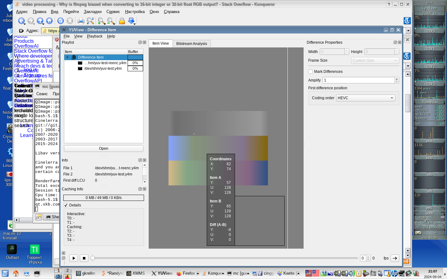 There is specific YUV viewer (qt5 based) https://github.com/IENT/YUView?tab=readme-ov-file Compiled on Slackware 15.0 i586 You can open both yuv test file and file reencoded by cingg (in yuv / y4m format, so no compression) and add "Difference sequence", drag both files there, select View -. split view -> split view -> side by side, then enable Zoom Box. so yeah, not really the same :( I suspect yuv444 8 bit full range from timeline converts wrongly to very same color format by swscale ? May be due to our wrong setup ... |
