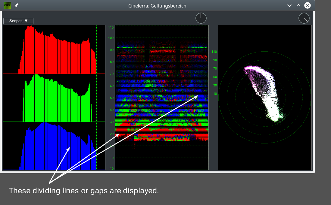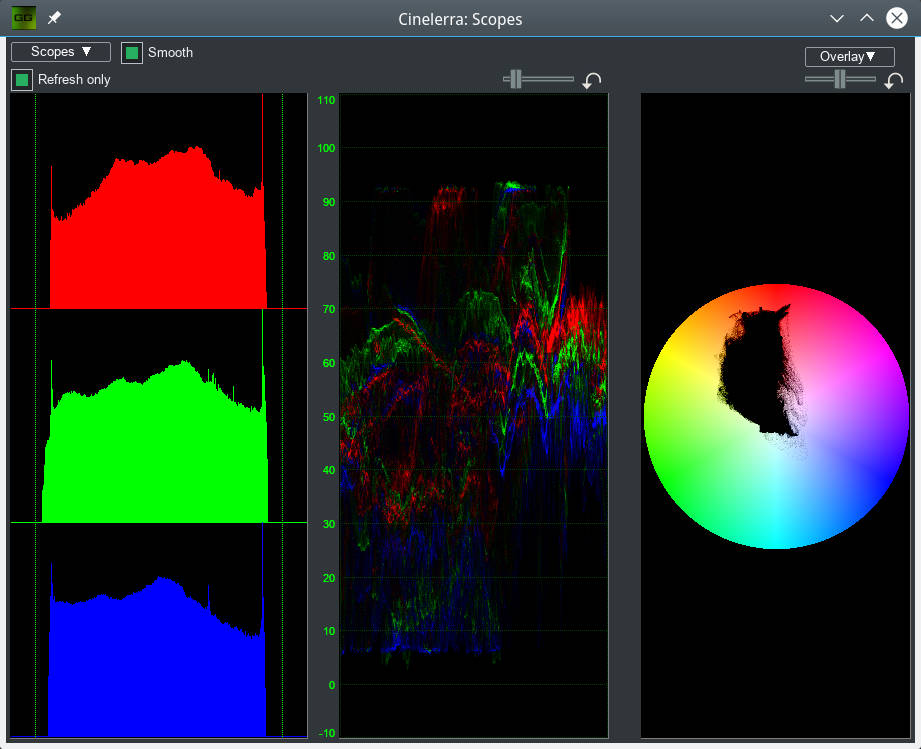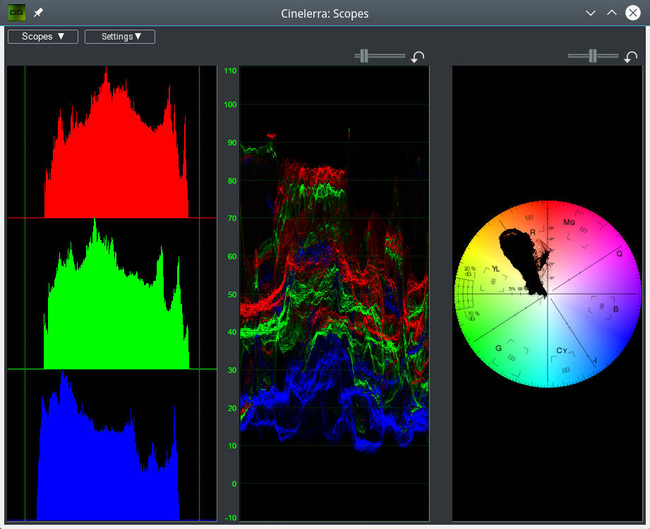 1 The histogram shows dividing lines again and again, see the attached picture. It's only a little thing, but this error has been going on for ages. It would be nice if these dividing lines are not shown, then it works as it should. 2. In the vectorscope the rings are displayed with dotted lines. Due to the fact that Cinelerra cannot handle subpixels, pixels that are close together are displayed thicker than diagonal pixels. Thus the rings look frazzled in some places. You can also see the problem of the waveform. The waveform in Cinelerra looks much rougher than in other NLEs like Kdenlive for example, which also handles subpixels. There the waveforms are very fine and detailed than in our case. The long term solution would be that Cinelerra also handles subpixels, the short term solution for the rings in the vectorscope would be that the pixels of the dotted line always have one or two pixel distance between the individual pixels, so there is less of this ugly effect. 3. I agree with Igor that sliders would be better than knobs. Knobs are more space-saving but very impractical to use. Also, the knobs don't look very aesthetic. As a designer I would rather use the sliders in Cinelerra. The knobs in Cinelerra probably don't look that good because subpixels don't work here either. 4. I personally find the drop-down menu better than the "ugly" icons that were seen before. Now it looks clearer. I am a friend of clear and simple interfaces. I'm not a friend of Apple's business methods, but in design they have met the ravages of time. Simplicity and clarity have become Apple's design characteristics and people like it. By the way, thanks for the improvements! |