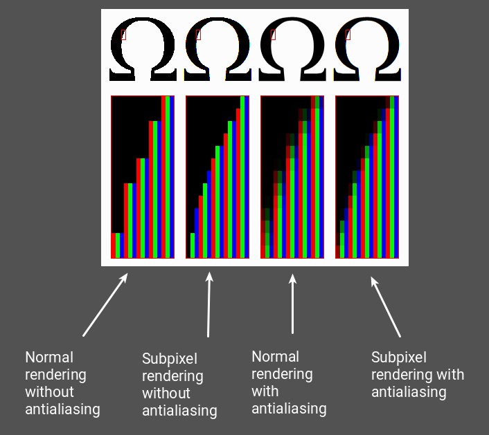 Here is a small article https://en.wikipedia.org/wiki/Subpixel_rendering , what I actually mean with the subpixel. With the term subpixel I mean the subpixel rendering with antialiasing. Here is a picture from the German Wikipedia, which shows the advantages of this technique. |