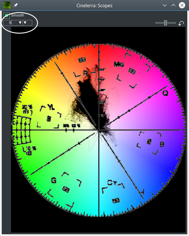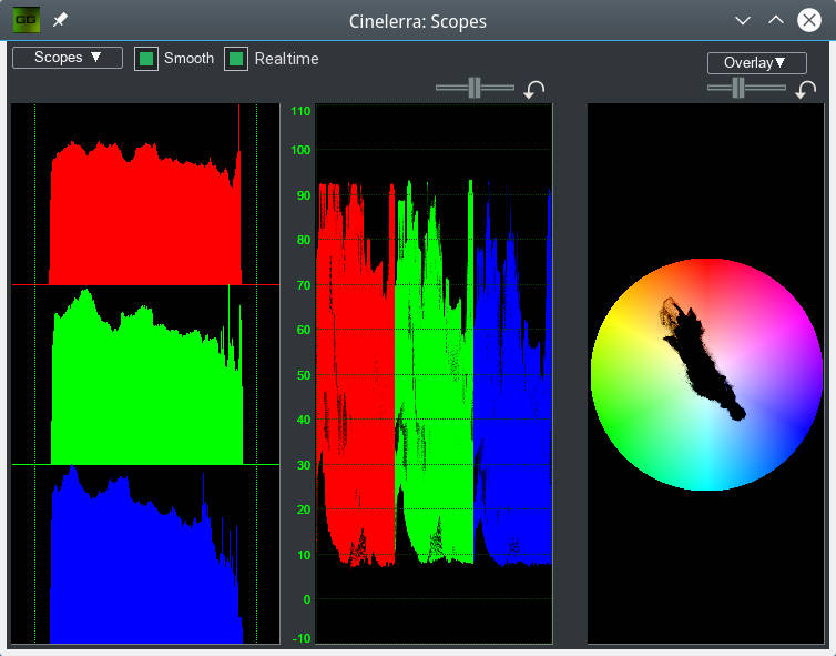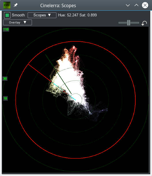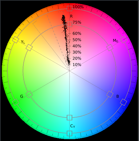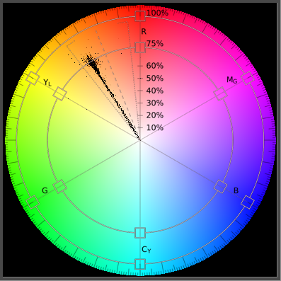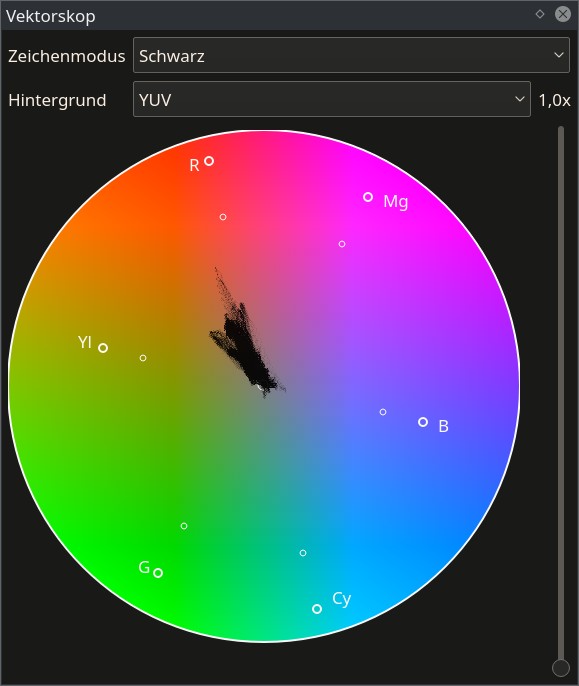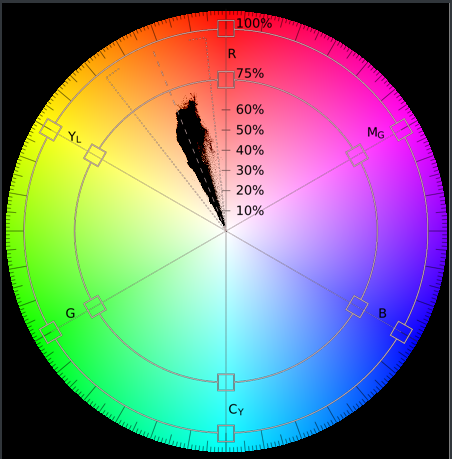 A little note, if you watched this video https://youtu.be/SP2Qj9-rV-w?t=20 it shows that the vectorscope corresponds to the color wheel. Kdenlive has added the possibility to show the color wheel in the background of the vectroscope. Below is a screenshot of this option. I find it very convenient. |