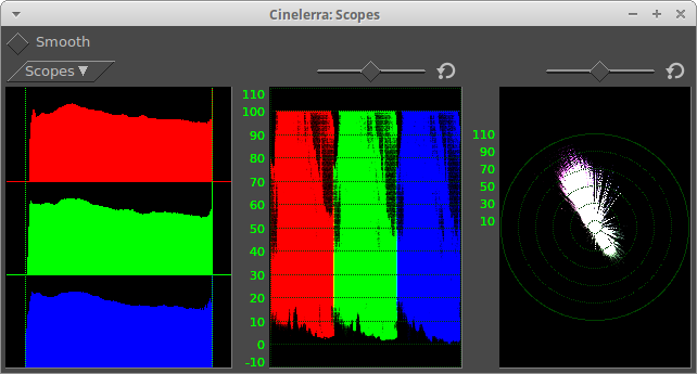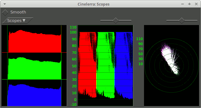 @Olaf I think that @Sam was speaking of the black line (vertical in Histogram and horizontal in Waveform), not about the grid green line, in correspondence of the scale's numbers. @Sam I see like in your picture (videoscope.png) when I stretch (enlarge) the window. If I make smaller the window to its minimum size it does not occur. Can you confirm or less, please? @All For the Scope Menu, what do you think divide the 6 different scopes with a line? So the User can understand that max only three charts are showed. Scope: -------------------- Histogram Histogram RGB -------------------- <-- Waveform Waveform RGB Waveform ply -------------------- <-- Vectorscope -------------------- And, It would be good to add a title above every chart. (mpfh,... I have to do a photomontage to explain better) |