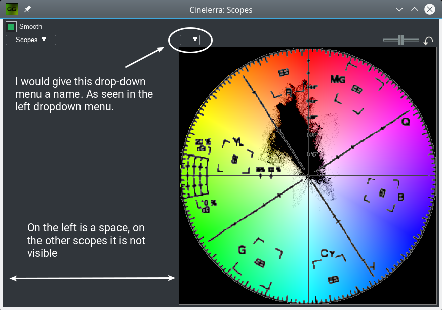 I would place the Scope button one line further up. The smooth button looks totally out of place in the current layout. The Smooth Button is not a detached function, but an addition to the different scopes and therefore does not need a separate line. I have attached a picture to it, here you can see at a glance that the Smooth option is an extension of the different scopes. It looks better this way. I would place the overlay button one line lower, it is only an option for the vectorscope and not a superior function for all other videoscopes. |