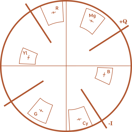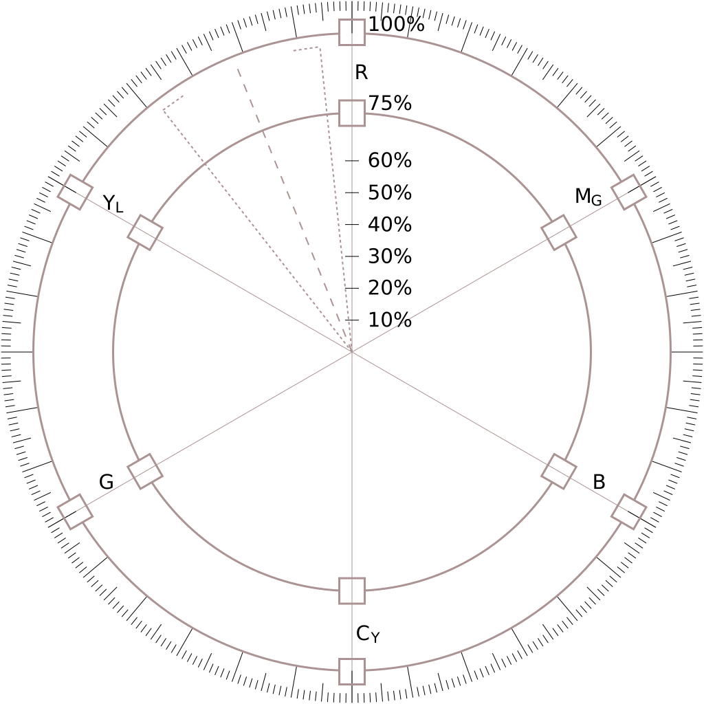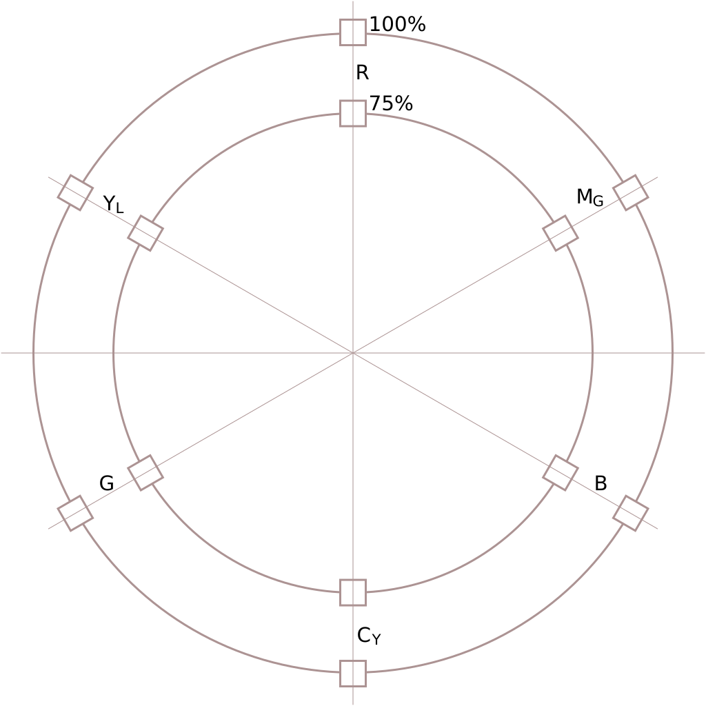 Thanks for the improvements! @Phyllis: to answer your questions based on Scopes-100.jpg: 1- The two 90° diameters are not necessary; instead the lines "I" and "Q" that are not shown in the image are. There is only a hint of the "+I" line. However, the "4 partial lines" serve to remember the color wheel below and therefore to "take measurements". 2- Yes it is "I" line; but it's better to make a complete diameter that also shows the opposite end "-I"; also it's better to add the other remarkable line: the "Q" line. 3- the six zones (RGB+CMY) are shown as you say; note that they represent 75% colors but there are variations so the result is not a regular hexagon but is elongated. 4- The shapes around 6 points of 75% serve to better visualize those areas (usually they are even larger than those shown). I think you can do a simple overlay of the grid of lines and points on the vectorscope because the ratios are always the same. You simply have to be able to resize together with the vectorscope. Note that histogram and waveform can be resized independently along X and Y, instead vectorscope (fortunately) always keeps the square geometry, resizing X and Y at the same time to keep the circle always proportioned. Being a simple oversized grid, I think it is easy to visualize it or hide it with a button. the most complicated part is that the color wheel of our vectorscope is quite rotated compared to that of DaVinci Resolve or other vectorscopes. It would be better to make it more standard, then it would be enough to take a grid from some program, customize it and then add it to our vectorscope. Or you can always take the std grid and rotate it to fit our color wheel. I tried to adapt a grid on our color wheel with Inkscape, but the result is very bad. The important lines are: "I" for the skintones (+I) and the blue of the sky (-I); "Q" for the greens of the grass (-Q). The six points are not arranged exactly symmetrically (120°), but derive from calibration with color tests (type F_pal75bars). The result is an elongated hexagon because the radius of the six points is not always the same (i.e. the various colors have slightly different saturation values if all set to 75%). I enclose an image of the vectorscope grid that I consider the most complete (and best) and also the most used color wheel. |