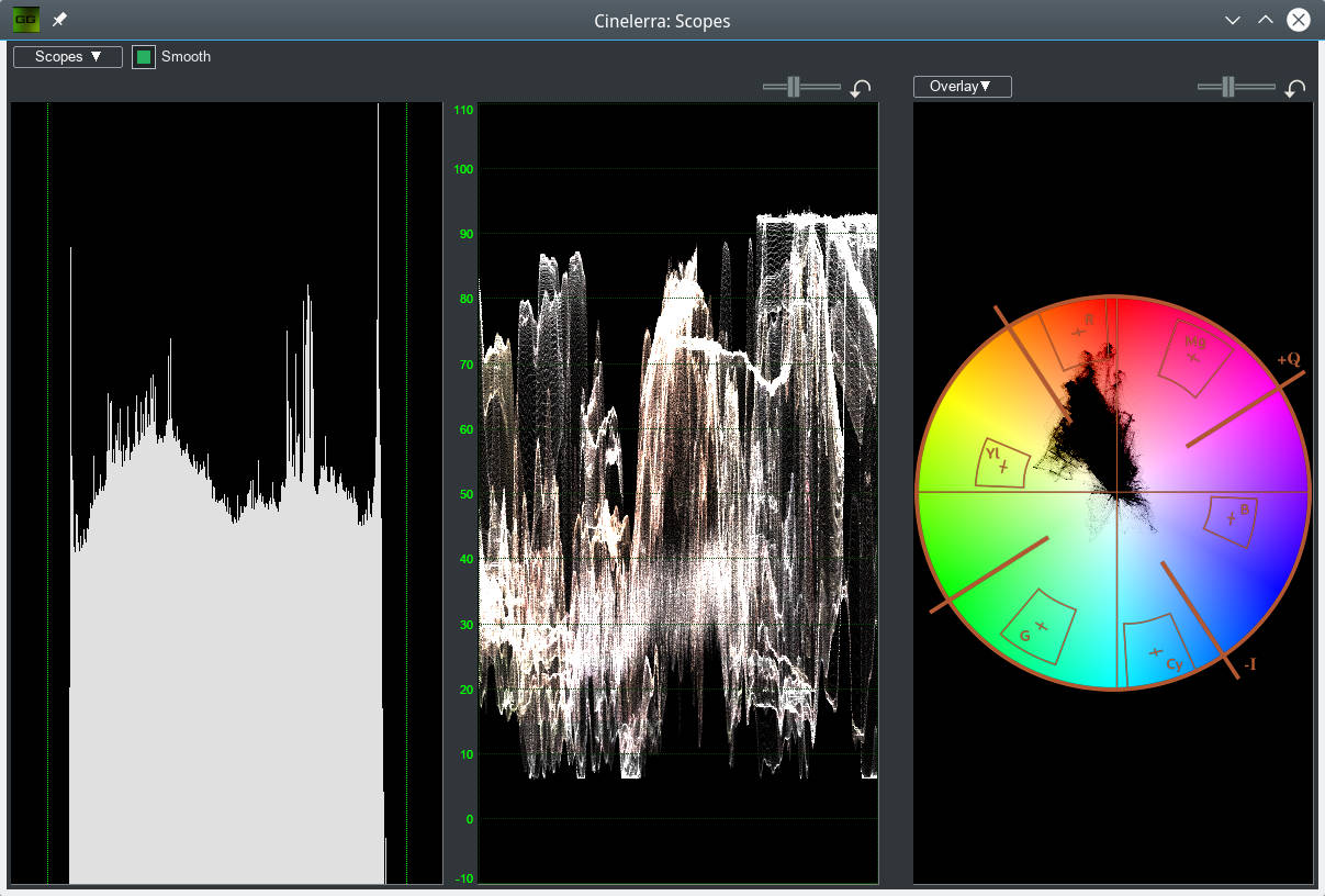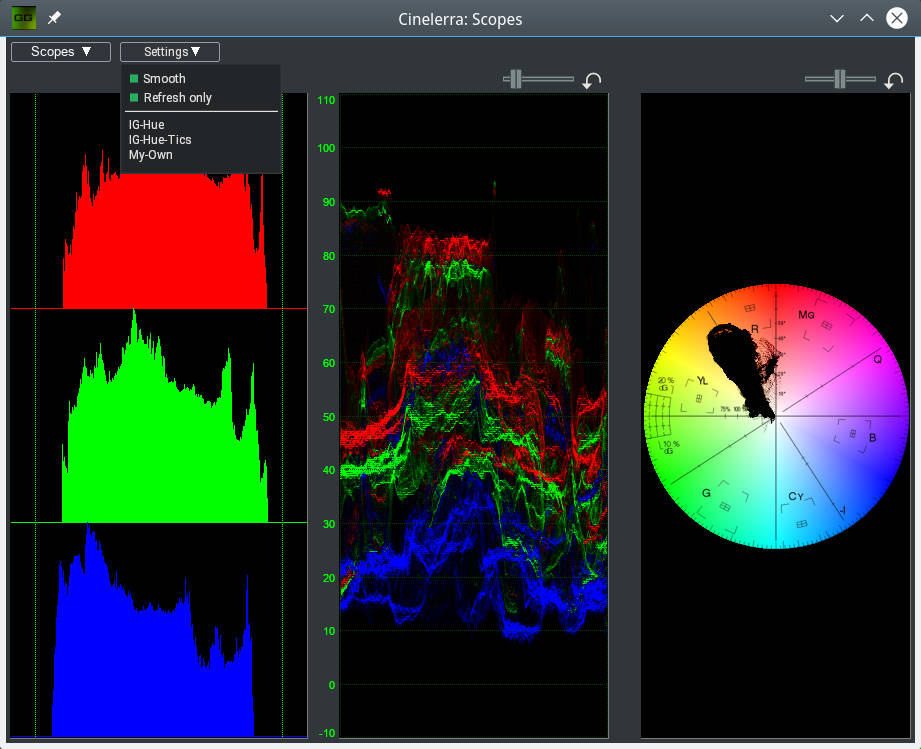 GIT checkin for improvements has been done. The I-line skin tone was added. New innovation -- besides the standard Vectorscope, there is now a VectorWheel choice in the pulldown menu. And when this choice is in effect, there is a down arrow to the left of its slider bar to choose an overlay. Now this overlay is fuzzy and "your assignment, should you choose to accept it" (quote from Mission Impossible!) is to create any overlay you like as a png, keep it to use for yourself by putting it in {cinelerra_path}/plugins/scopes, or provide it for inclusion for GPL usage in Cinelerra for everyone. |